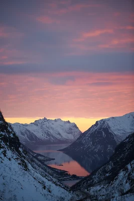 Nous retournerons vers Tromsø et nous profiterons des lumières arctiques lors de ce trajet. Nous passons dans des fjords au pied des alpes de Lyngen.